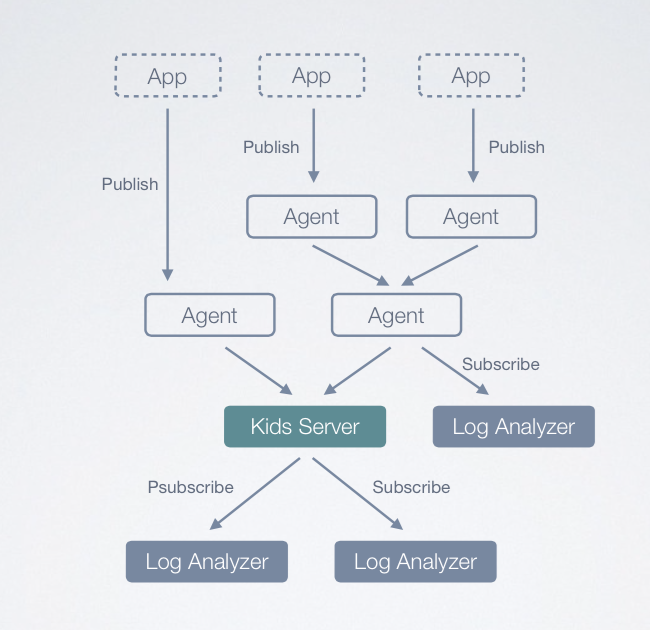Kids参考了Scribe的思路。Kdis在每台服务器上可以配置成Agent或Server。Agent直接接受来自应用的消息,把消息汇集之后,可以打给下一个Agent或者直接打给中心Server。订阅日志时,可以从Server上获取,也可以从中心节点的一些Agent上获取。