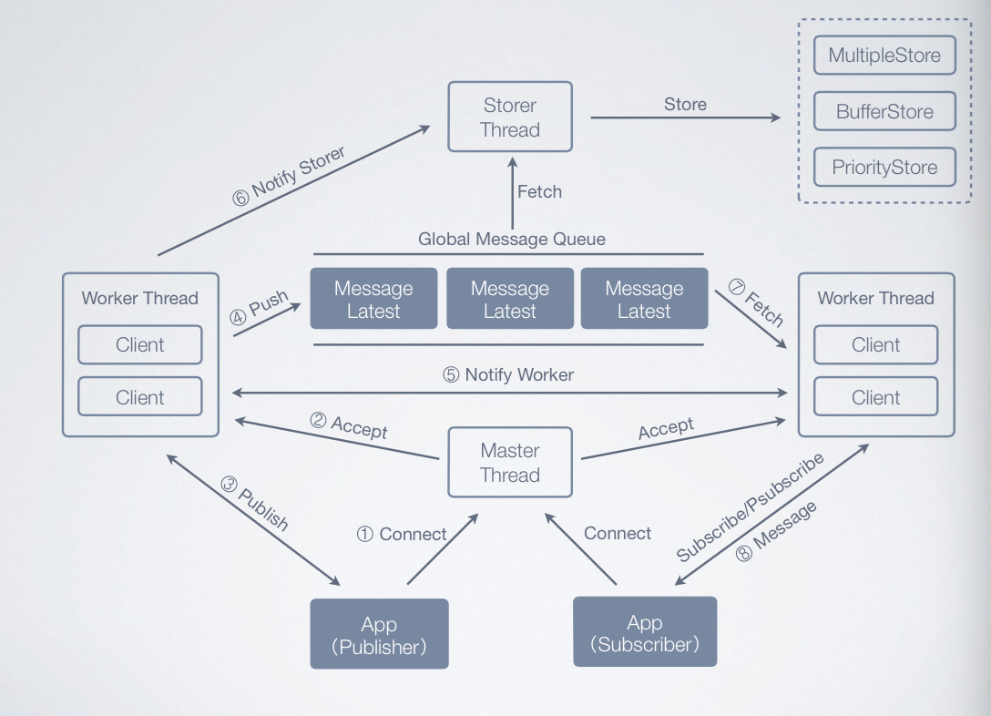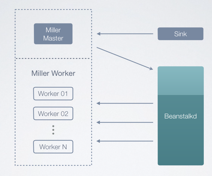 举例而言,如果现在有用户回答了问题,首先系统会把问题写到MySQL里面,把消息塞到Sink,然后把问题返回给用户。Sink通过Miller把任务发给 Beanstalkd,Worker自己可以找到任务并处理。