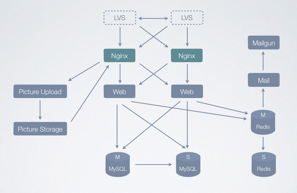 这是当时那个阶段的架构图,Web和数据库都做了主从。当时的图片服务托管在又拍云上。除了主从,为了性能更好还做了读写分离。为解决同步问题,又添加了一个服务器来跑离线脚本,避免对线上服务造成响应延迟。另外,为改进内网的吞吐量延迟,还更换了设备,使整个内网的吞吐量翻了20倍。